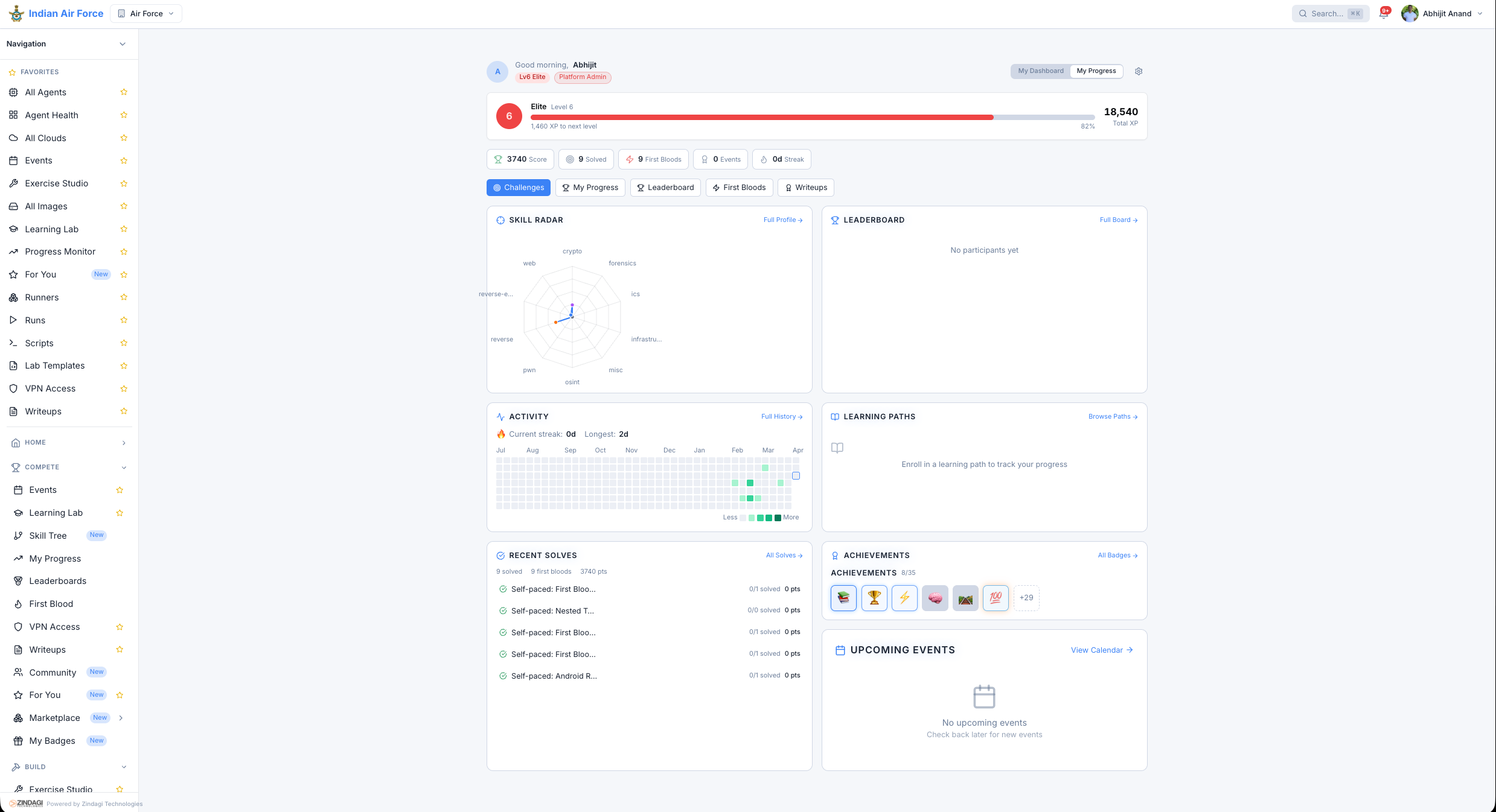 Track your progress with skill charts, leaderboards, achievements, and upcoming events — all in one view.