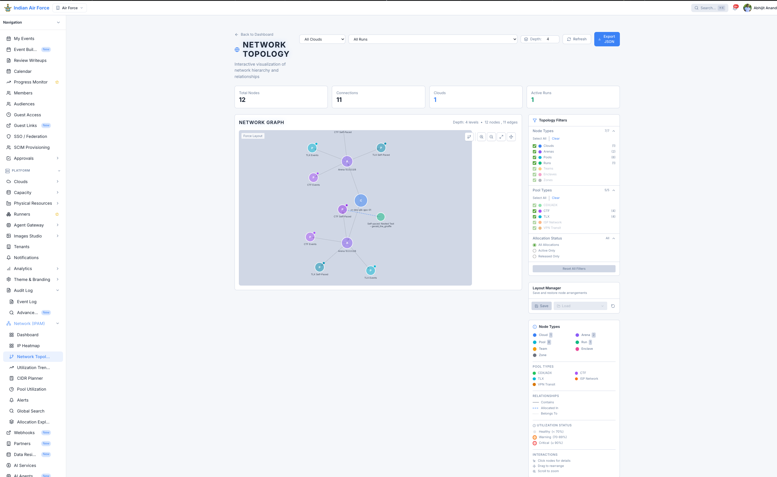 Live network graph visualization with node types, subnets, and topology filtering.
