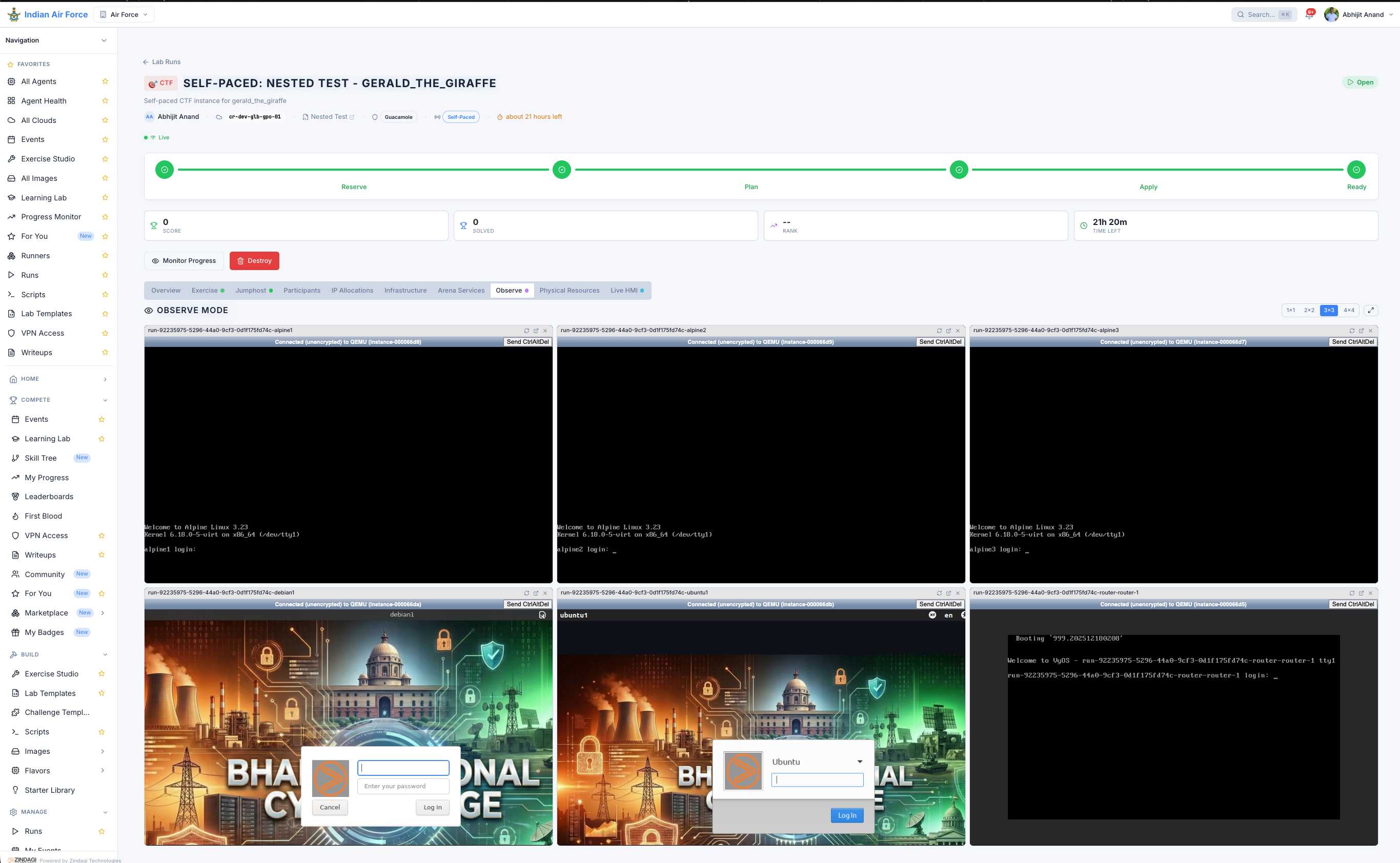 Real-time monitoring of participant VM sessions during live exercises.