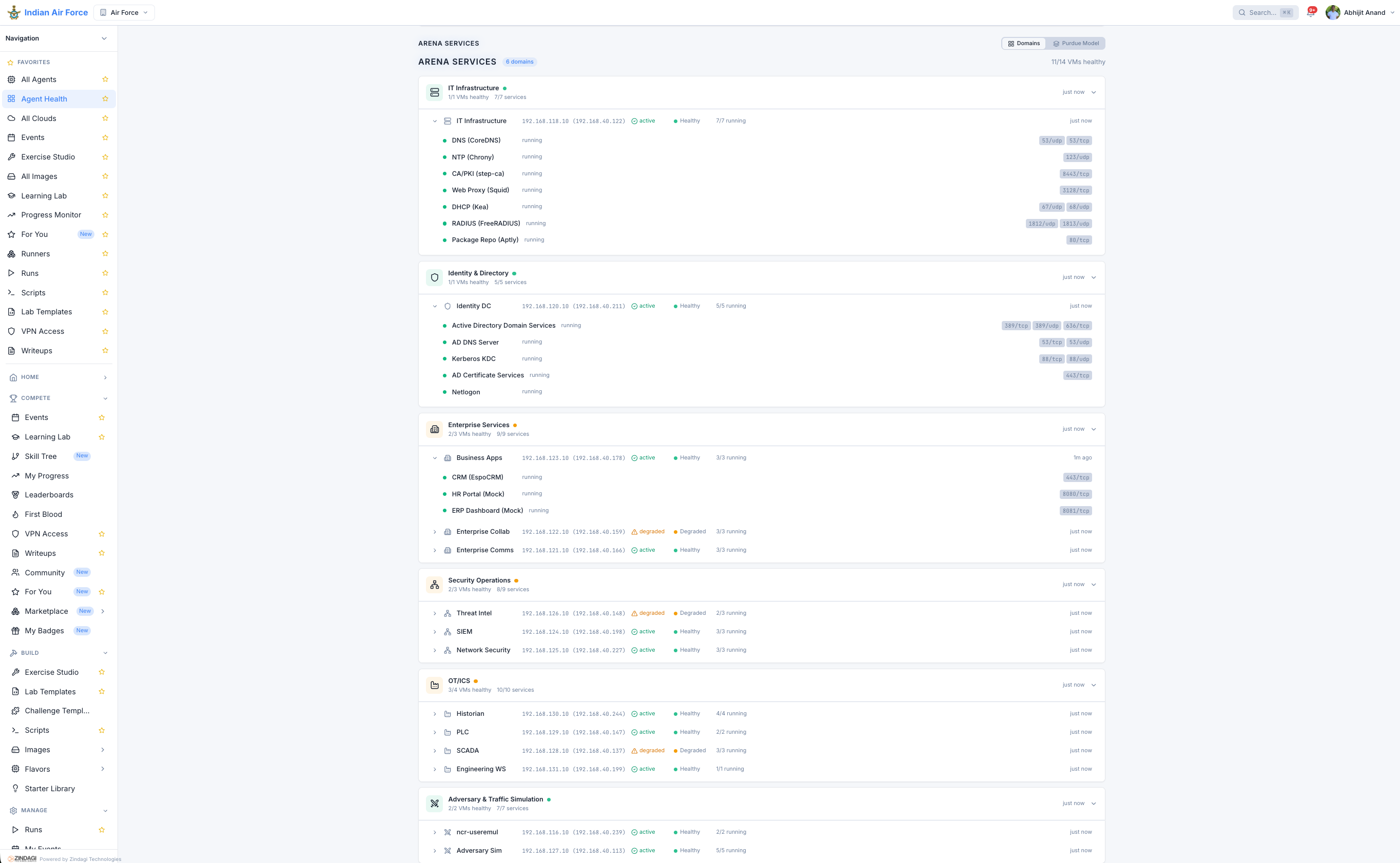 Multi-service arena deployment with network function simulation and attack surface mapping.